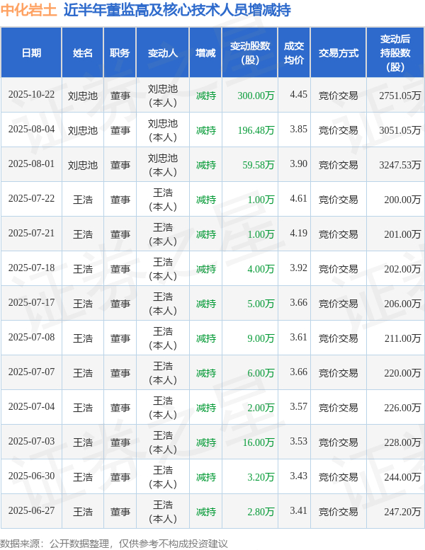 中化岩土近半年内的董监高及核心技术人员增减持详情如下: