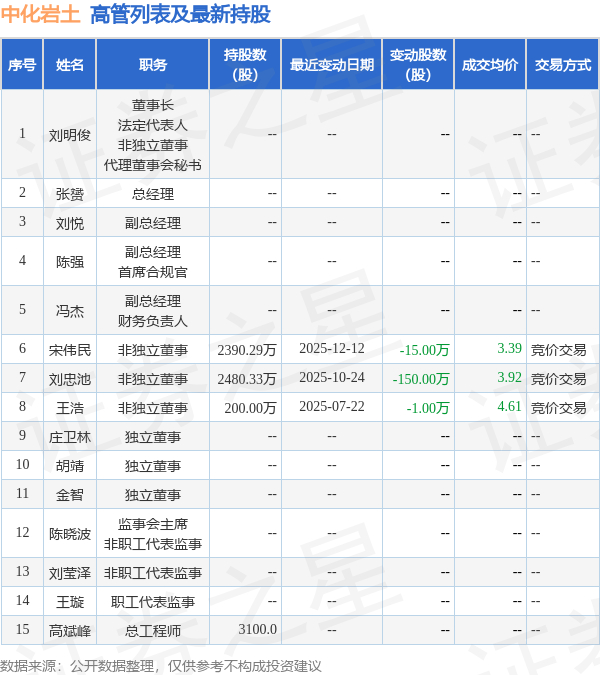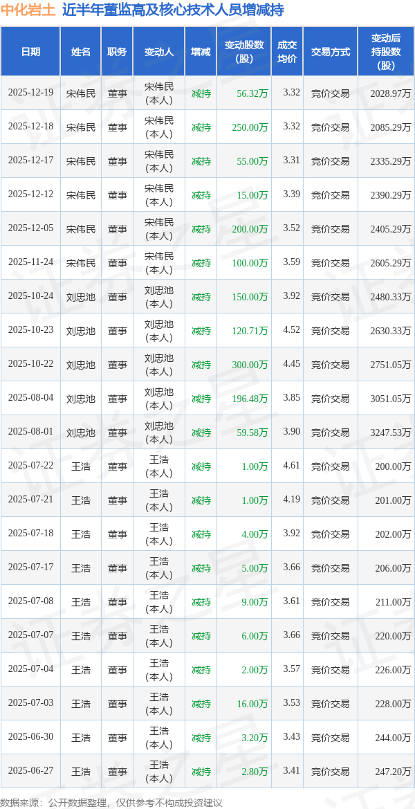 中化岩土近半年内的董监高及核心技术人员增减持详情如下: