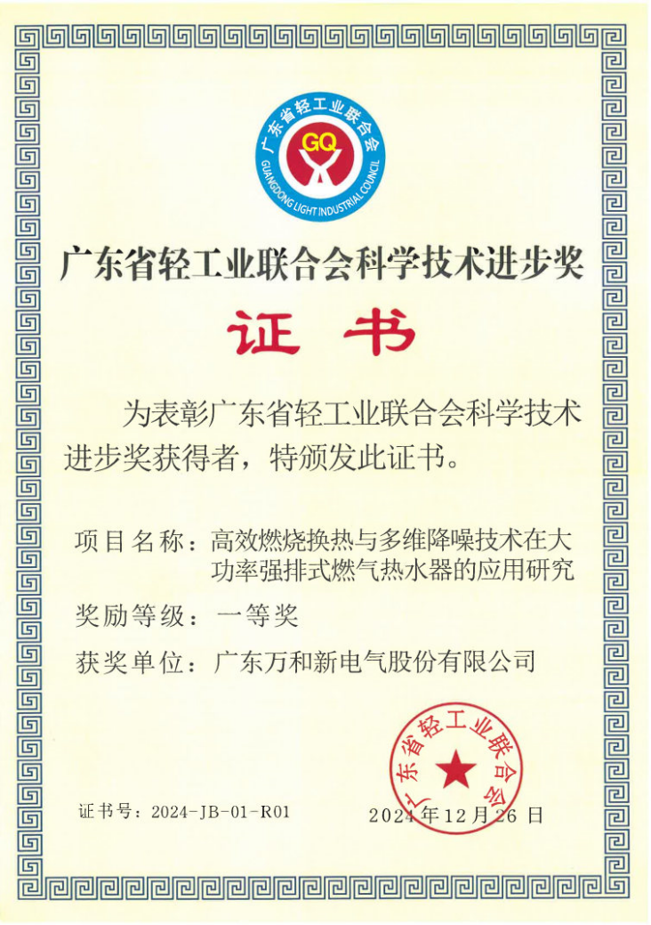 广东万和新电气股份有限公司研发的“高效燃烧换热与多维降噪技术在大功率强排式燃气热水器的应用研究”项目荣获科技进步一等奖。该项目通过研发多涵道分流比例高效燃烧技术、桥形导流强化换热技术以及多维降噪技术,突破了大流量、大功率强排式燃气热水器的技术瓶颈,实现了节能静音,并极大地改善用户多点用水的洗浴体验。