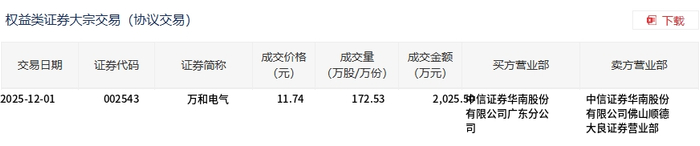 12月1日,万和电气大宗交易成交172.53万股,成交额2025.5万元,占当日总成交额的31.39%,成交价11.74元,较市场收盘价10.81元溢价8.6%。