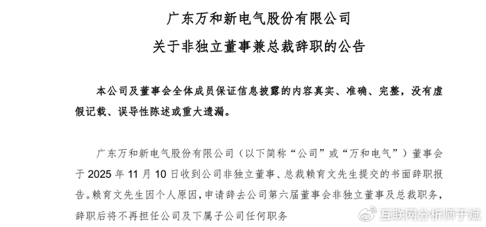 2025年,万和电气高管变动频繁:7月,公司实际控制人之一卢楚鹏辞去副总裁职务;8月,赖育文被提名为非独立董事候选人,9月经股东大会表决通过,11月便骤然辞职。如此短暂的高管任期,在A股上市公司中实属罕见。