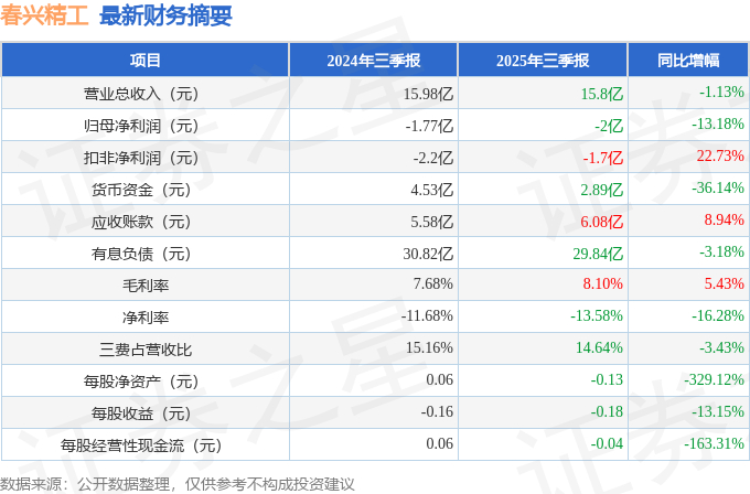 据证券之星公开数据整理,近期春兴精工(002547)发布2025年三季报。截至本报告期末,公司营业总收入15.8亿元,同比下降1.13%,归母净利润-2.0亿元,同比下降13.18%。按单季度数据看,第三季度营业总收入6.02亿元,同比上升2.07%,第三季度归母净利润-7105.94万元,同比下降43.38%。本报告期春兴精工短期债务压力上升,流动比率达0.46。
