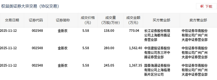 11月12日,金新农大宗交易成交663.05万股,成交额3699.79万元,占当日总成交额的11.92%,成交价5.58元,较市场收盘价5.69元折价1.93%。