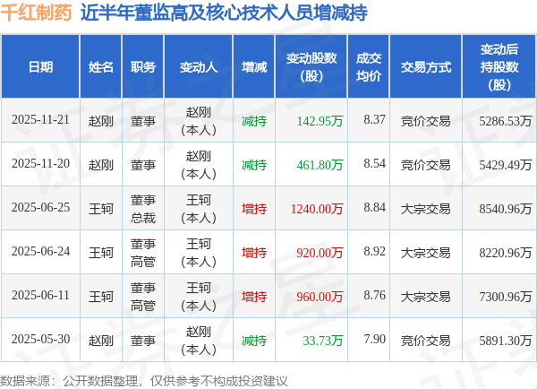 证券之星消息,根据11月24日市场公开信息、上市公司公告及交易所披露数据整理,千红制药(002550)最新董监高及相关人员股份变动情况:2025年11月21日公司董事赵刚共减持公司股份142.95万股,占公司总股本为0.1117%。变动期间公司股价下跌3.28%,11月21日当日收盘报8.25元。