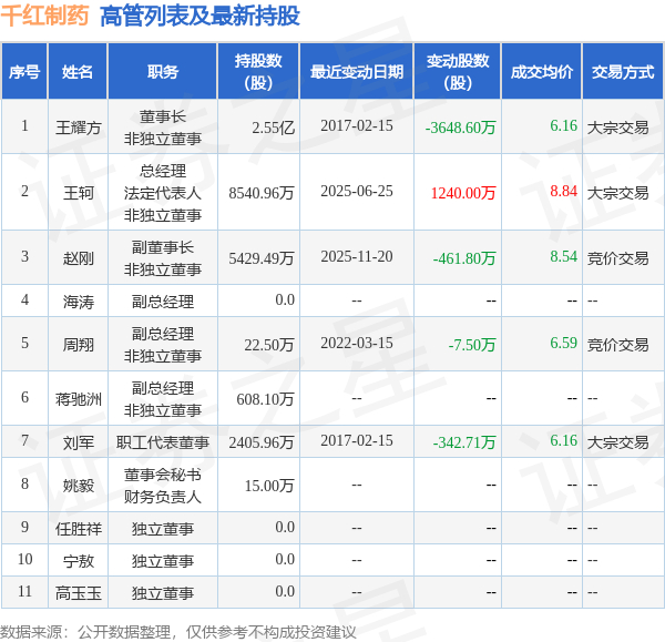 千红制药的高管列表及最新持股情况如下: