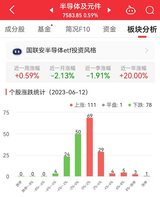 中国经济网北京6月12日讯 今日,半导体及元件板块整体涨幅0.59%,其中,111只股票上涨,1只股票平盘,78只股票下跌。