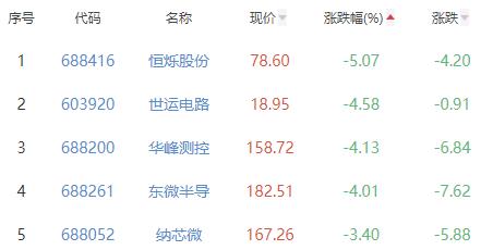 恒烁股份、世运电路、华峰测控、东微半导、纳芯微位列涨幅榜后五位,涨幅分别为-5.07%、-4.58%、-4.13%、-4.01%、-3.40%。