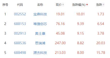 其中,宝鼎科技、唯捷创芯、奥士康、思瑞浦、源杰科技位列板块涨幅前五位,涨幅分别为10.01%、9.39%、9.15%、8.82%、8.00%。