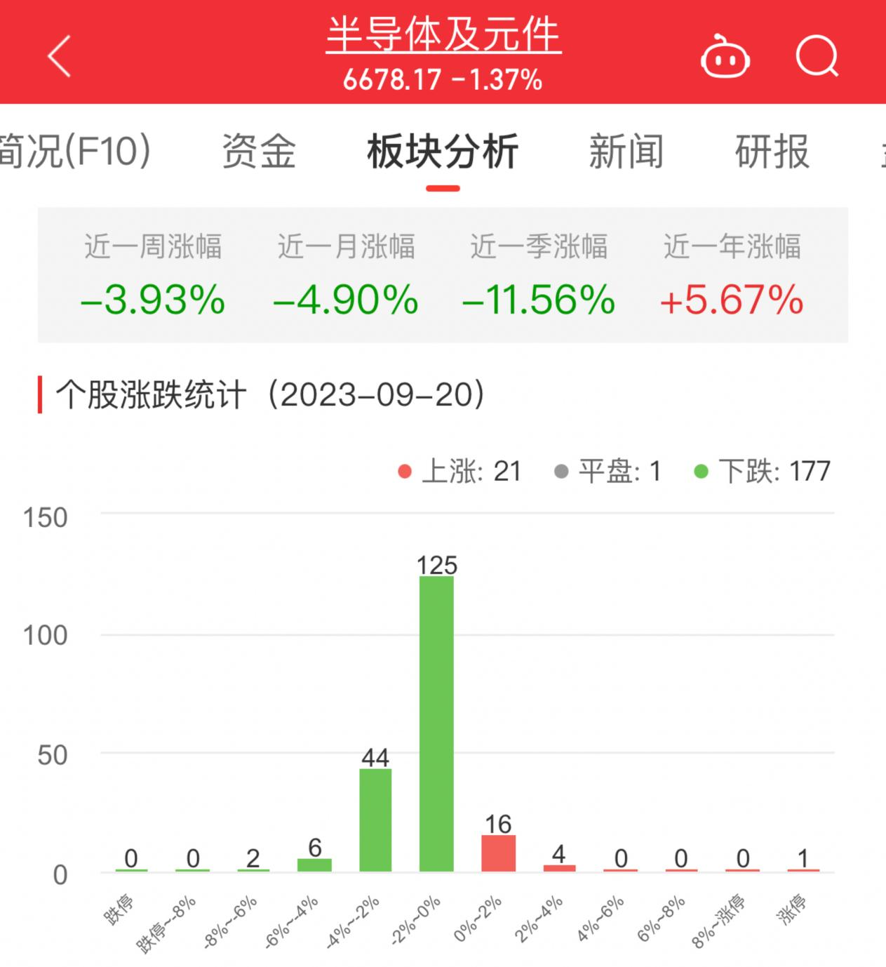 中国经济网北京9月20日讯 今日,半导体及元件板块整体跌幅1.37%,其中21只股票上涨,1只股票平盘,177只股票下跌。