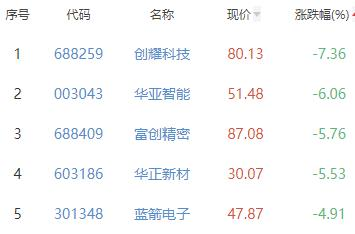 创耀科技、华亚智能、富创精密、华正新材、蓝箭电子位列涨幅榜后五位,涨幅分别为-7.36%、-6.06%、-5.76%、-5.53%、-4.91%。