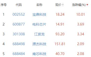 其中,宝鼎科技、电科芯片、江波龙、源杰科技、南芯科技位列板块涨幅前五位,涨幅分别为10.01%、3.69%、3.34%、2.09%、2.08%。