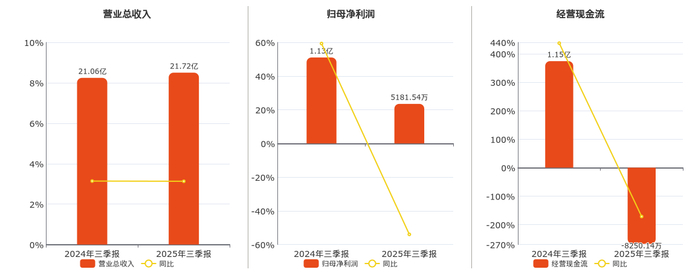 公司营业总收入为21.72亿元,在已披露的同业公司中排名第22,较去年同报告期营业总收入增加6585.32万元,同比较去年同期上涨3.13%。归母净利润为5181.54万元,在已披露的同业公司中排名第77,较去年同报告期归母净利润减少6073.63万元,同比较去年同期下降53.96%。经营活动现金净流入为-8250.14万元,在已披露的同业公司中排名第138,较去年同报告期经营活动现金净流入减少1.98亿元,同比较去年同期下降171.52%。