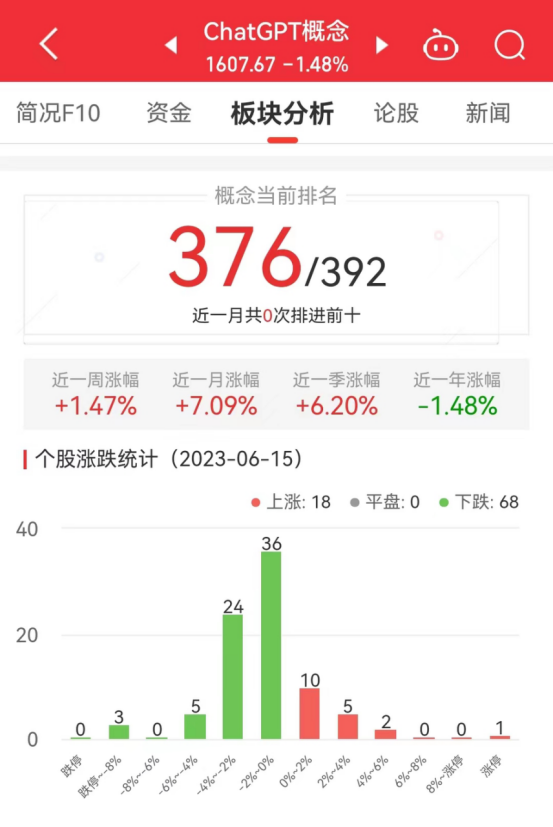 中国经济网北京6月15日讯今日,ChatGPT板块整体涨幅-1.48%,其中18只股票上涨,0只股票平盘,68只股票下跌。