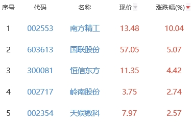 其中,南方精工、国联股份、恒信东方、岭南股份、天娱数科位列板块涨幅前五位,涨幅分别为10.04%、5.07%、4.42%、2.74%、2.57%。