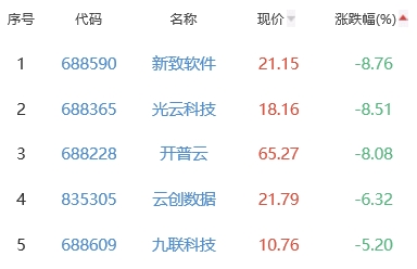 新致软件、光云科技、开普云、云创数据、九联科技位列涨幅榜后五位,涨幅分别为-8.76%、-8.51%、-8.08%、-6.32%、-5.20%。