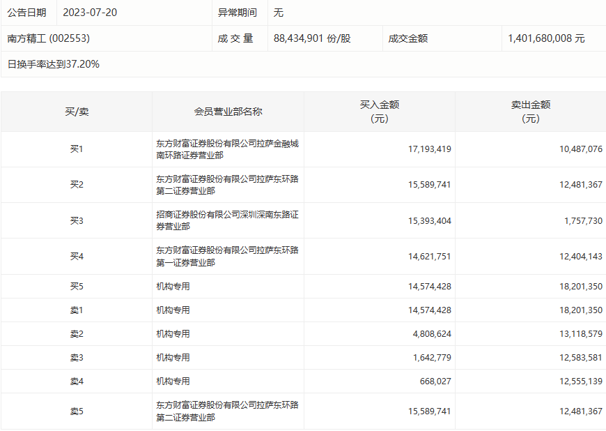 7月20日,南方精工今日涨7.73%,龙虎榜数据显示,上榜营业部席位全天成交1.78亿元,占当日总成交金额比例为12.7%。其中,买入金额为8449.22万元,卖出金额为9358.9万元,合计净卖出909.68万元。