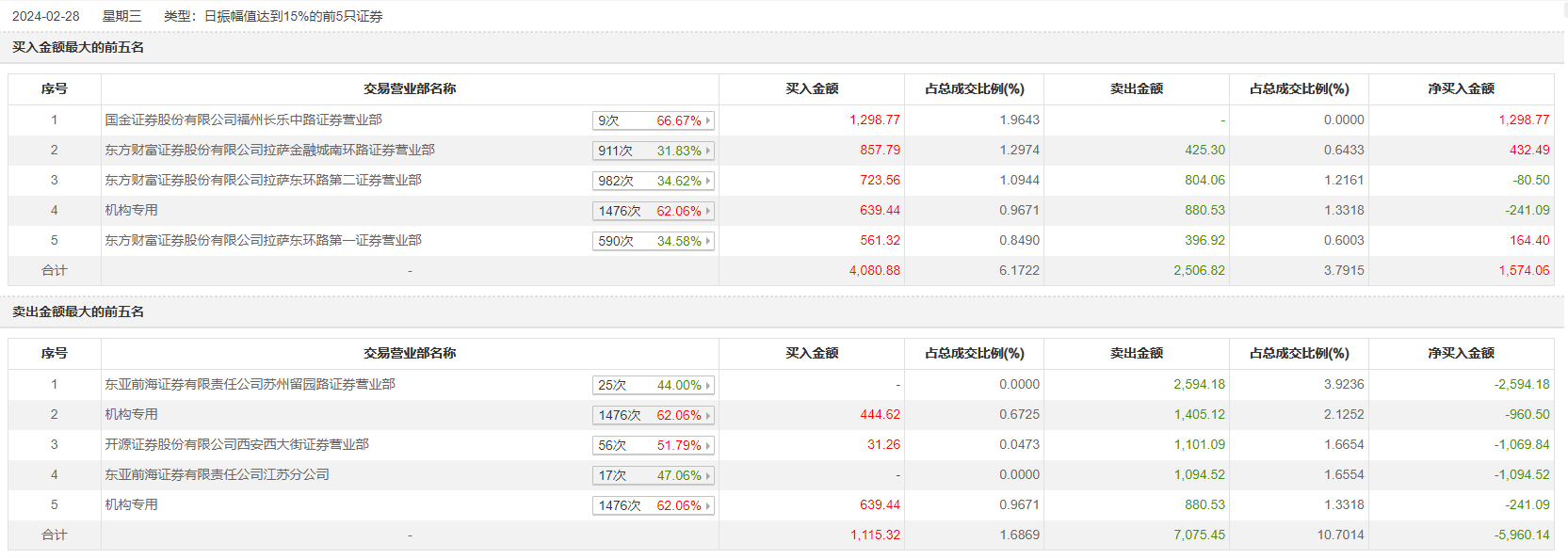具体来看,机构买入1084.06万元,卖出2285.66万元,合计净卖出1201.6万元。此外,东亚前海证券苏州留园路证券营业部、开源证券西安西大街证券营业部分别卖出2594.18万元、1101.09万元;国金证券福州长乐中路证券营业部、东方财富证券拉萨金融城南环路证券营业部分别买入1298.77万元、857.79万元。