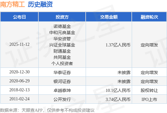 【投融资动态】南方精工定向增发融资,融资额1.37亿人民币,投资方为诺德基金、中和元良基金等