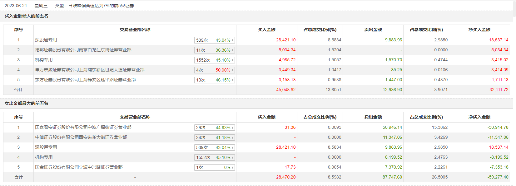 6月21日,三七互娱今日跌停,龙虎榜数据显示,上榜营业部席位全天成交13.59亿元,占当日总成交金额比例为41.04%。其中,买入金额为4.51亿元,卖出金额为9.08亿元,合计净卖出4.57亿元。