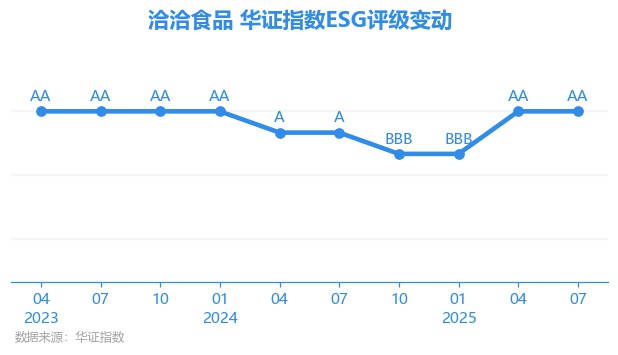 日前,华证指数公布了新一期(2025年7月31日)的ESG评级结果,洽洽食品(002557.SZ)获得AA评级(华证指数评级为C起至AAA九档,C为最低档,AAA为其最高一级评级/AA为其第二档),上一期(2025年4月30日)ESG评级为AA。本期ESG评级在156家食品行业A股上市公司中排名第4(上一期排名第2)。