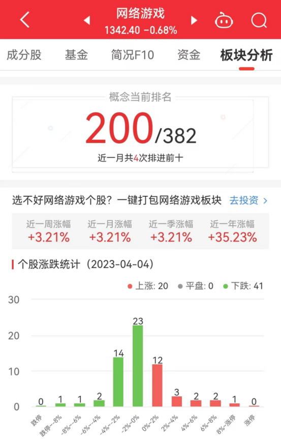 中国经济网北京4月4日讯今日,网络游戏板块整体涨幅-0.68%,其中20只股票上涨,0只股票平盘,41只股票下跌。