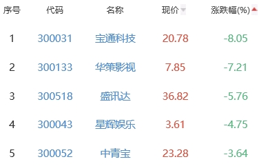 宝通科技、华策影视、盛讯达、星辉娱乐、中青宝位列涨幅榜后五位,涨幅分别为-8.05%、-7.21%、-5.76%、-4.75%、-3.64%。