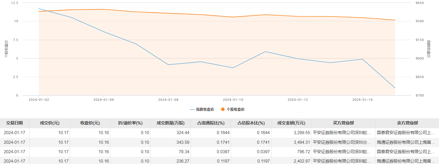 1月17日大宗交易成交982.64万股,成交额9993.45万元,占当日总成交额的22.62%,成交价10.17元,较市场收盘价溢价0.1%。
