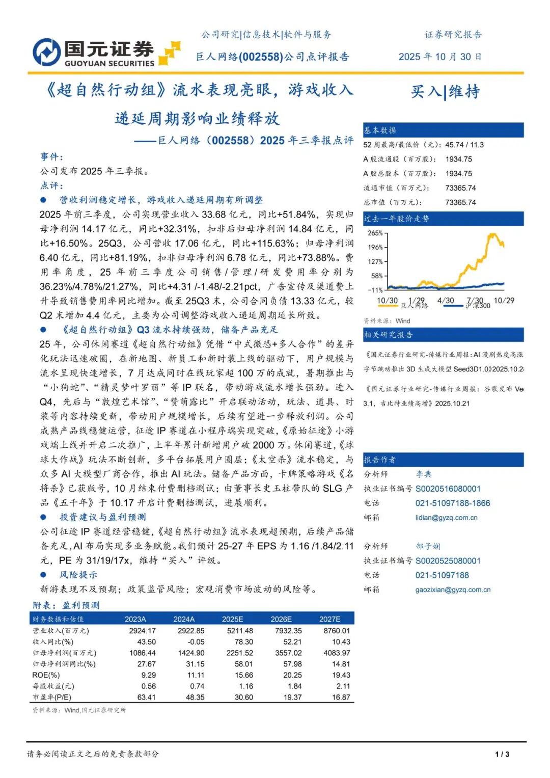 本报告摘自国元证券2025年10月30日已发布的《《超自然行动组》流水表现亮眼,游戏收入递延周期影响业绩释放——巨人网络(002558)2025年三季报点评》,具体报告及分析内容请详见报告。若因对报告的摘编等产生歧义,应以报告发布当日的完整内容为准。