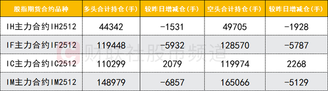 四大期指主力合约中,IH、IF、IM合约多空双方均减仓,IM合约多头减仓数量较多。