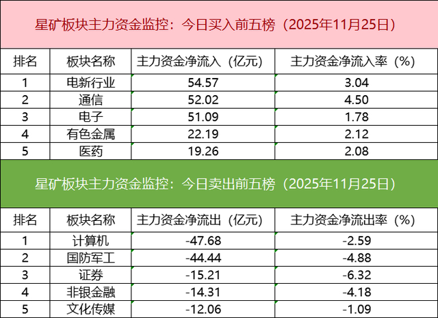 从主力板块资金监控数据来看,电新行业主力资金净流入居首。