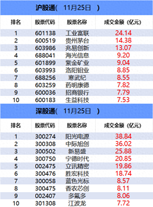 从沪股通前十大成交个股来看,工业富联位居首位;贵州茅台和兆易创新分居二、三位。