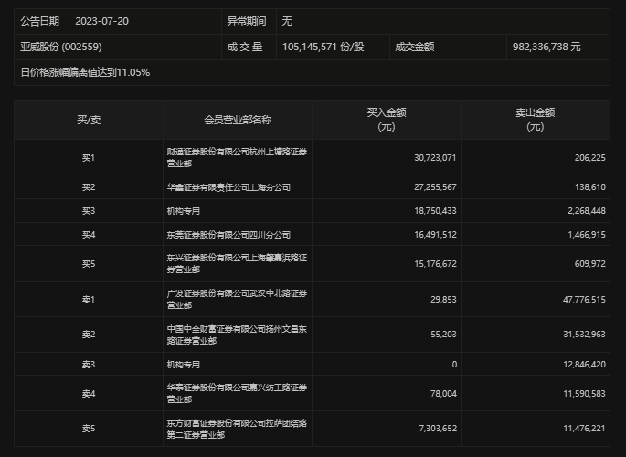 7月20日,亚威股份今日涨停,龙虎榜数据显示,上榜营业部席位全天成交2.36亿元,占当日总成交金额比例为24%。其中,买入金额为1.16亿元,卖出金额为1.2亿元,合计净卖出404.89万元。