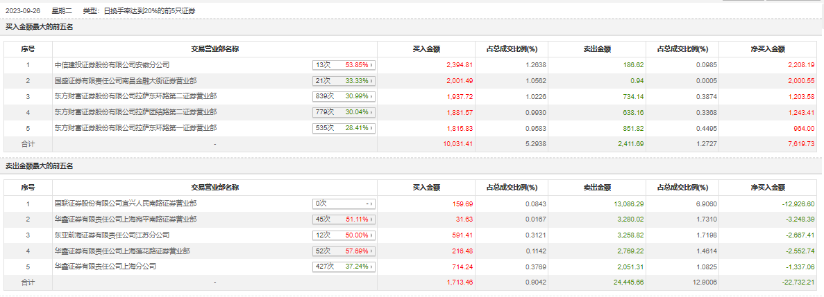 其中,中信建投证券安徽分公司、国盛证券南昌金融大街证券营业部分别买入2394.81万元、2001.49万元;国联证券宜兴人民南路证券营业部、炒股养家(华鑫证券上海宛平南路证券营业部)分别卖出1.31亿元、3280.02万元。
