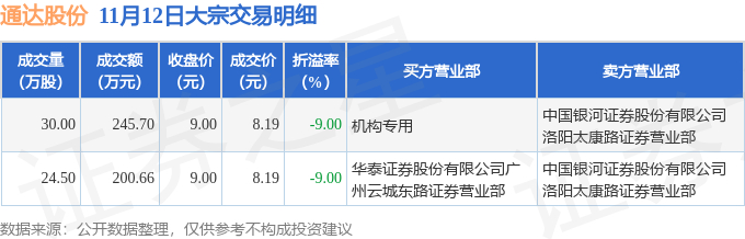 11月12日通达股份现2笔大宗交易 机构净买入245.7万元