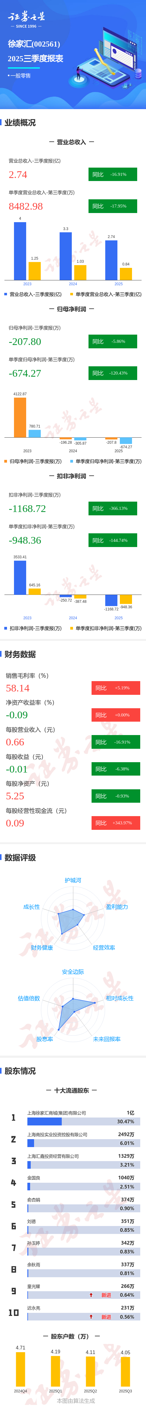 图解徐家汇三季报:第三季度单季净利润同比下降120.44%