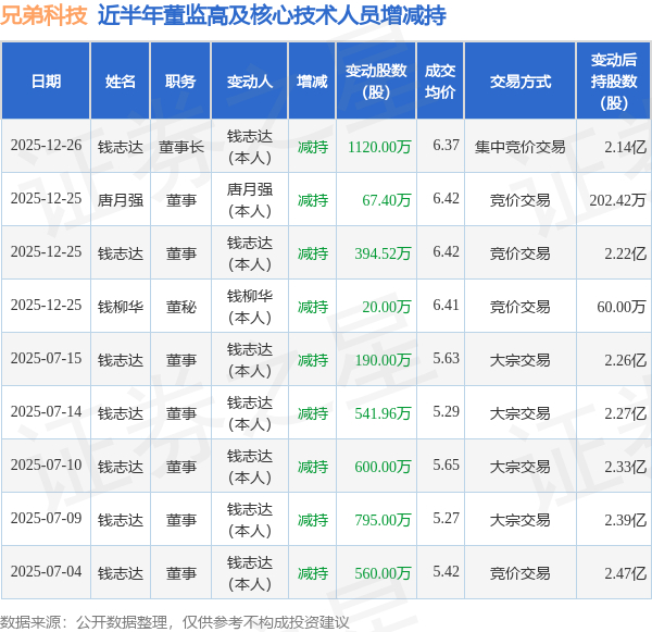 兄弟科技:12月25日至12月26日高管钱志达、唐月强、钱柳华减持股份合计1601.92万股