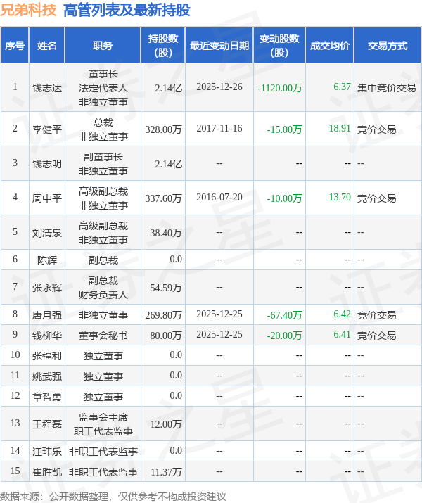 兄弟科技的高管列表及最新持股情况如下: