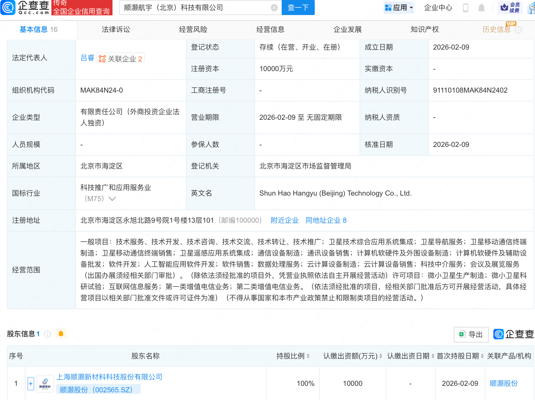 企查查APP显示,近日,顺灏航宇(北京)科技有限公司成立,注册资本1亿元,经营范围包含:卫星技术综合应用系统集成;卫星导航服务;卫星移动通信终端制造;卫星移动通信终端销售;卫星遥感应用系统集成等。企查查股权穿透显示,该公司由顺灏股份(002565.SZ)全资持股。