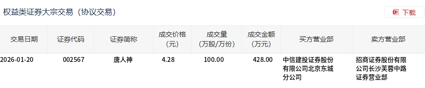 唐人神今日大宗交易折价成交100万股,成交额428万元