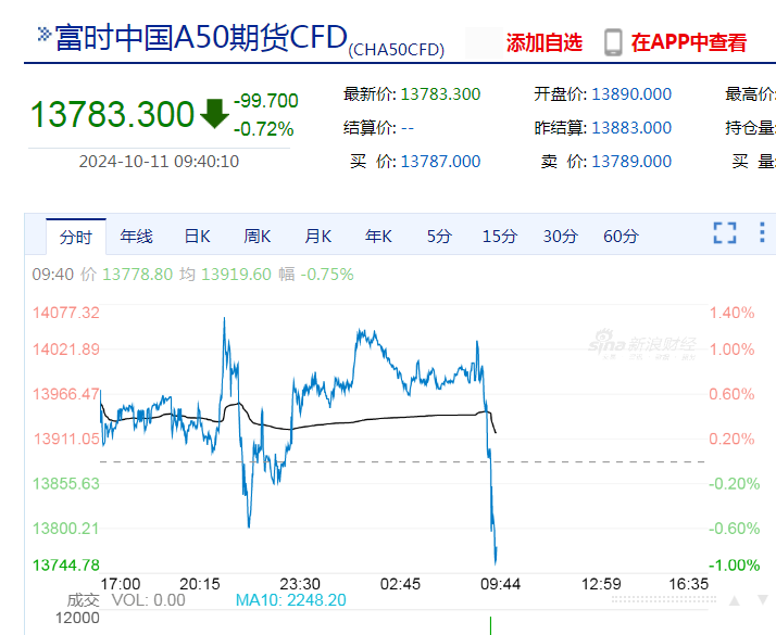 截至发稿,富时中国A50指数期货跌0.72%。