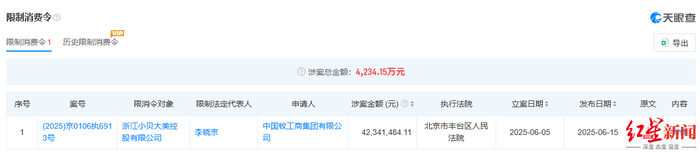 在因多起借款合同纠纷被告上法庭后,“奶粉第一股”贝因美第一大股东“小贝大美”债务缠身。天眼查信息显示,小贝大美及其实控人李晓京被限制高消费,涉案总金额为4234.15万元。