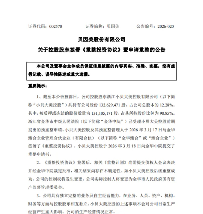 当日,贝因美发布关于控股股东签署《重整投资协议》暨申请重整的公告。公告显示,截至本公告披露日,公司控股股东浙江小贝大美控股有限公司(以下简称“小贝大美控股”)共持有公司股份 132,629,471 股,占公司总股本的12.28%。浙江省金华市中级人民法院(以下简称“金华中院”)已受理小贝大美控股前期提出的预重整申请。小贝大美控股及其预重整管理人于2026 年3 月17 日与金华臻合企业管理合伙企业(有限合伙)(以下简称“金华臻合”或“臻合企业”)签署了《重整投资协议》。小贝大美控股于 2026 年 3 月18 日向金华中院提交了重整申请书。