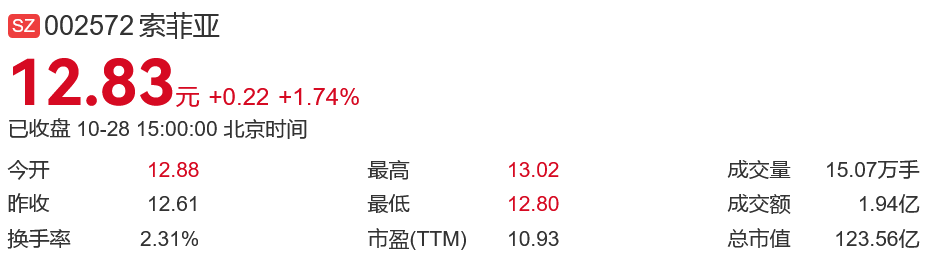 今日收盘,索菲亚股价12.83元,当日上涨1.74%,总市值123.56亿元。