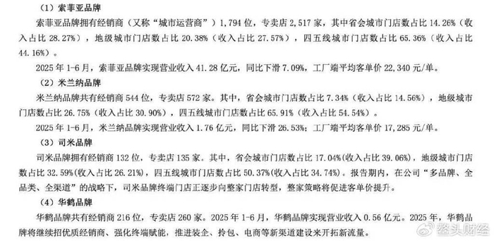 更需要注意的,今年上半年,索菲亚旗下的主要品牌营业收入也下降明显。其中,索菲亚品牌实现营业收入41.28亿元,同比下滑7.09%,工厂端平均客单价为22340元/单;米兰纳品牌营业收入为1.76亿元,同比下滑26.53%,工厂端平均客单价为17285元/单。
