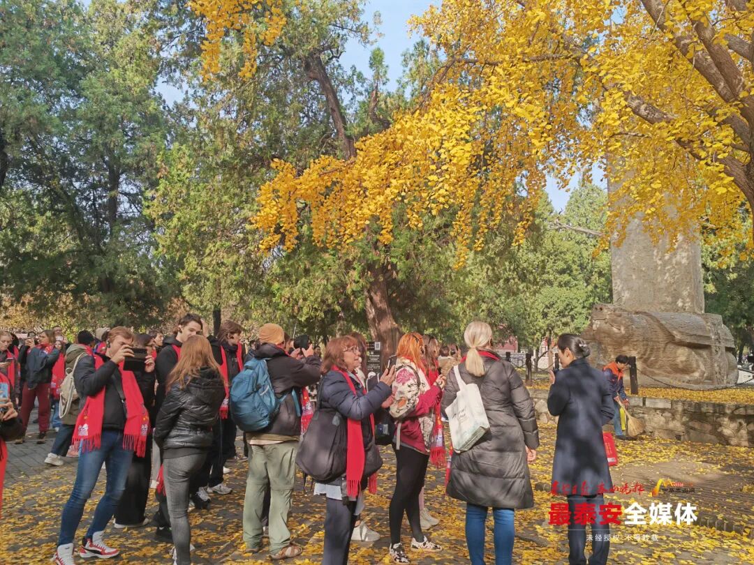 岱庙里,古银杏树金黄的叶片在阳光下透亮,微风拂过,叶片簌簌落在青砖步道上,铺成了一条柔软的“黄金小径”。舞团成员驻足银杏树下,有的抬手接住飘落的叶片细细端详,有的与同伴在树下合影,红色围巾与金黄银杏相映成趣。参观过程中,舞团成员认真聆听工作人员讲解古树、古建、石碑与岱庙的千年故事。
