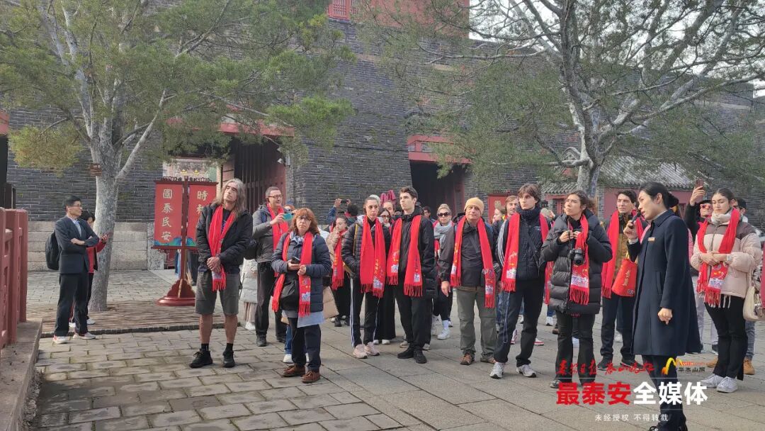 活动中,泰山景区向芭蕾舞团成员赠送了象征平安吉祥的红色围巾、富有泰山文化特色的景泰蓝泰山风景看盘。芭蕾舞团成员走进岱庙,沉浸式体验“东岳神府”深厚的历史文化底蕴。