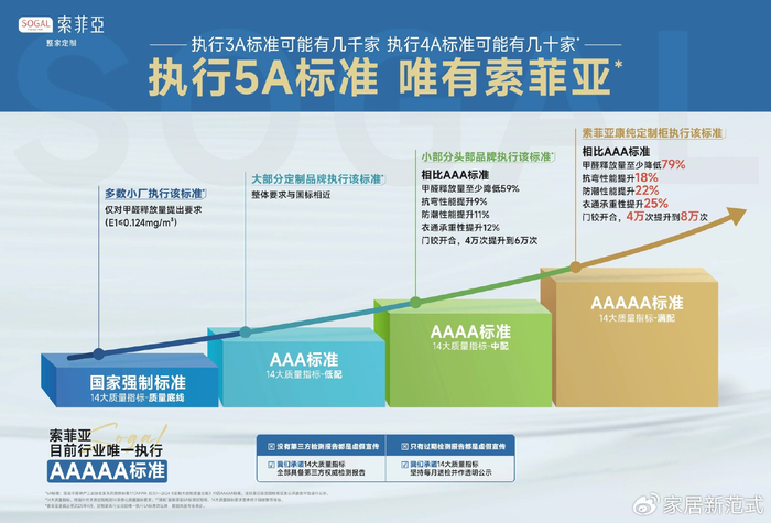二是“好”字。索菲亚跳出感性维度,率先将“非标服务”嵌入“中国定制家5A标准”体系,以5A满配品质的好产品、5A好设计、5A好服务这3个维度实现确定性的“好”效果。