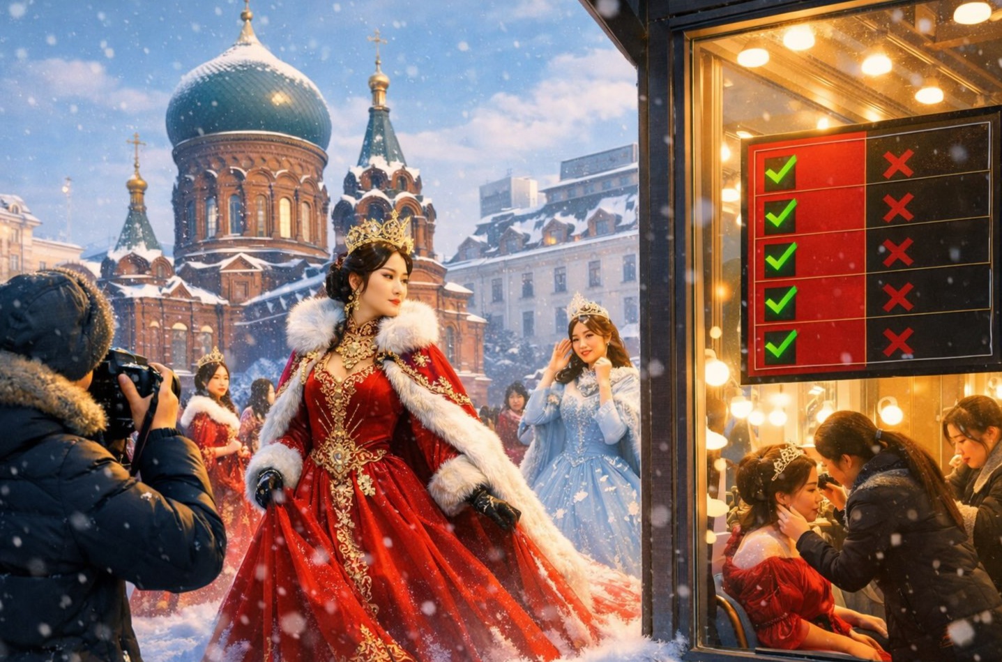 2026年春节期间,来自天南地北的游客在哈尔滨尽享冰雪游乐,其中索菲亚广场是必打卡项目之一。女性游客希望头戴璀璨王冠、身着绮丽华服,在历史悠久的教堂广场上留影。这一需求也迅速催生出冰雪旅拍新风尚。