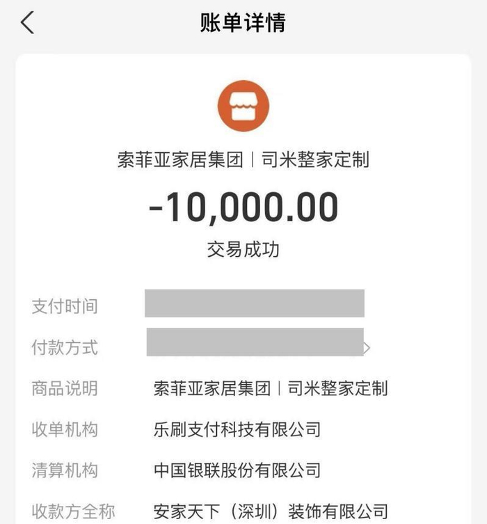“经销商在跑路前一两天仍在收款。”业主特别指出,与经销商签约的合同主体为深圳市司米装饰有限公司(以下简称“司米公司”),但实际收款方却是一家名为安家天下(深圳)装饰有限公司(以下简称“安家天下”)的公司。从工商信息来看,两家公司无股权关系。