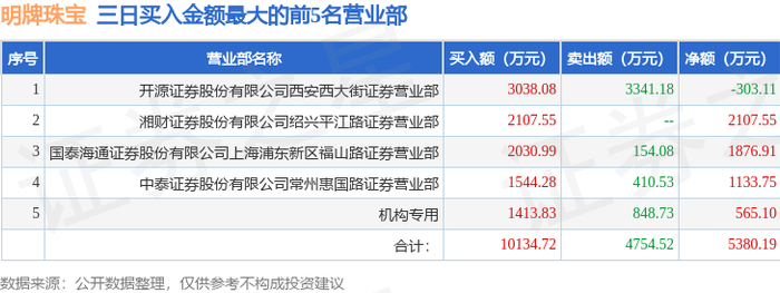 1月13日明牌珠宝(002574)龙虎榜数据:机构净卖出112.72万元(3日)